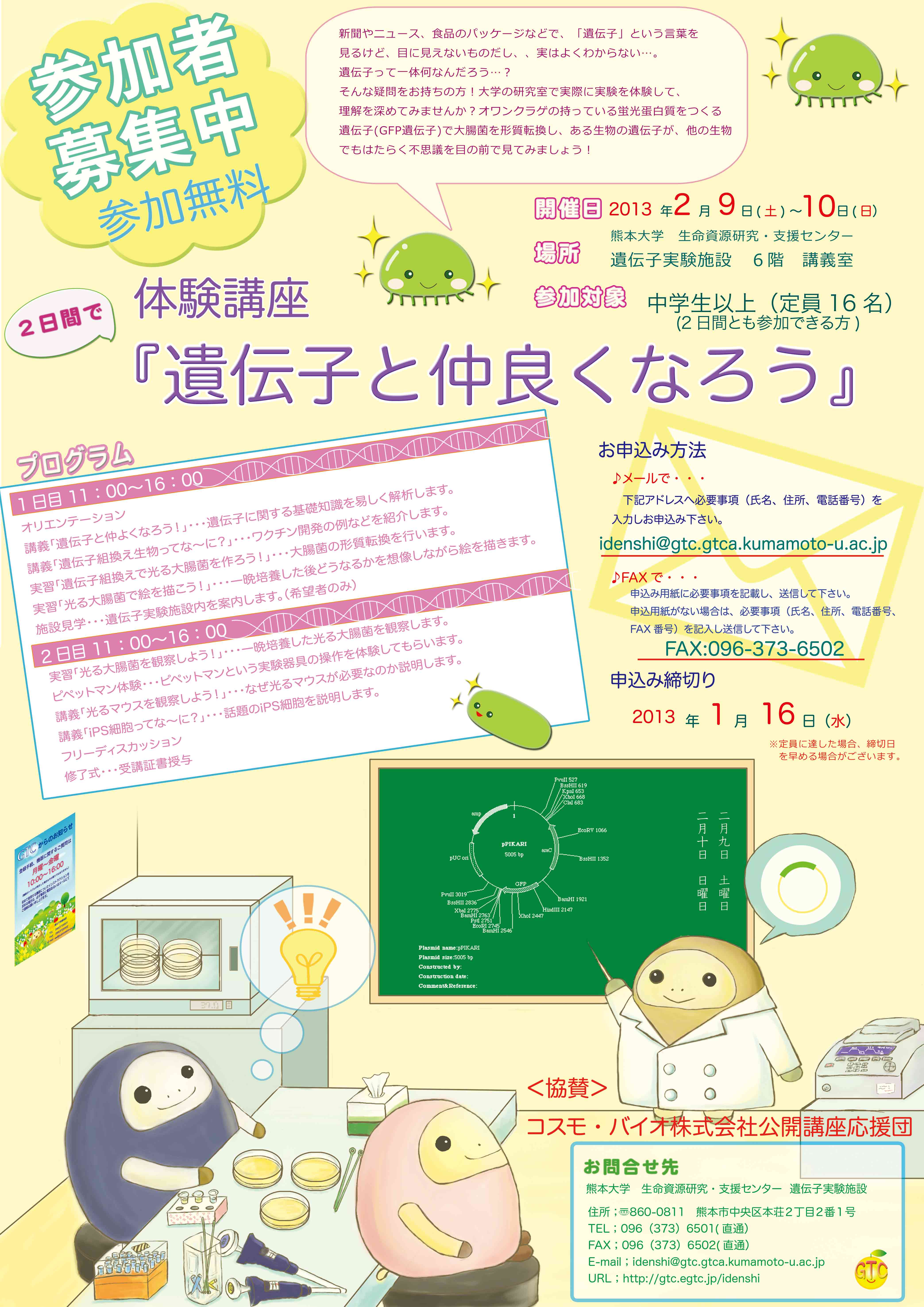 096-373-6501 idenshi@gtc.gtca.※ (迷惑メールへの対策のため、メールアドレスの kumamoto-u.ac.jp を※に置き換えております) |